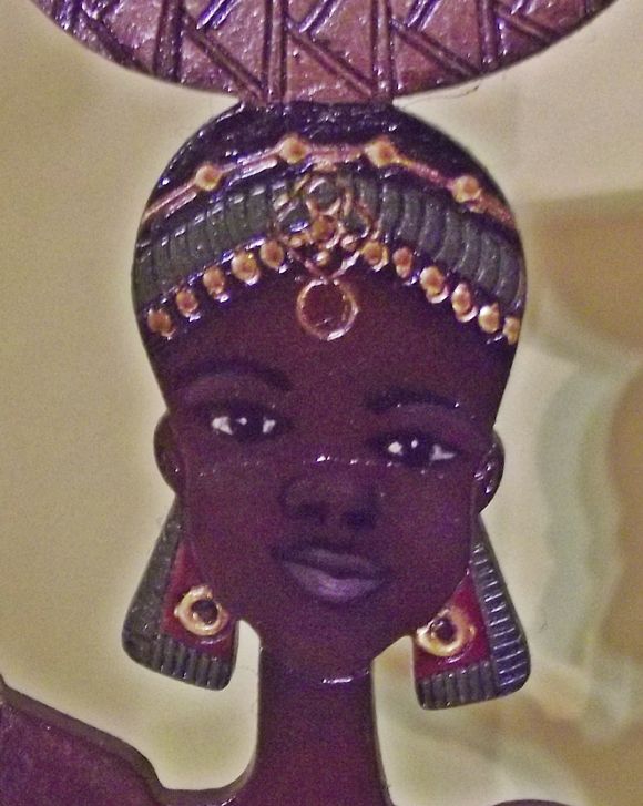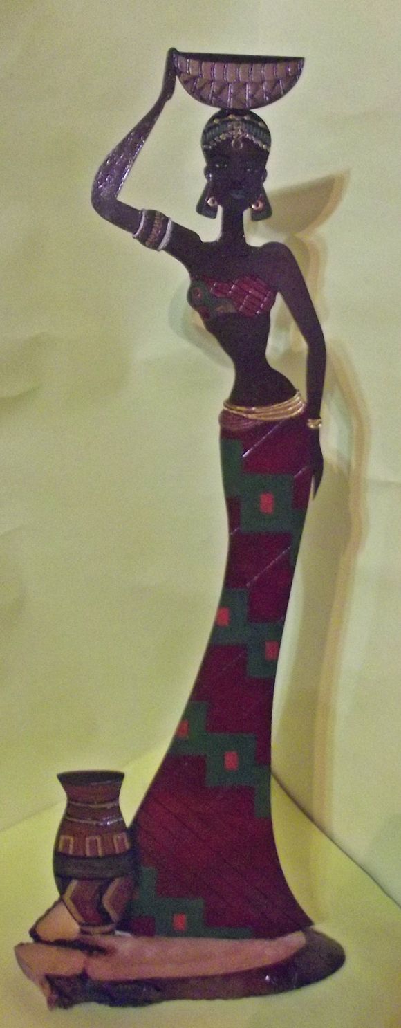 Aplique de MDF, silhueta de africana, totalmente pintado à mão, incrustrado em retalho de madeira natural, rústica. Mede: 15cmC x 8cmL x 42cmA Pesa: 100gr